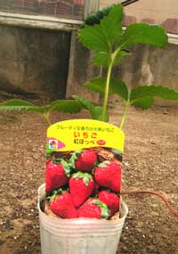 長めの円錐形状になる大きめの果実が特徴です。フルーティな芳香をもち、果皮は鮮やかな赤色で美しく、果肉も、桃紅色に色づき、甘酸のバランンスがとれた、大変ジューシーでおいしいイチゴです。生育は比較的旺盛で大株になりますので、2週間に一度程度の定期的な追肥とこまめな摘葉を心がけます。